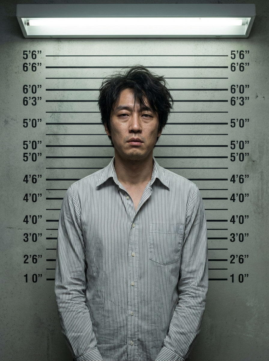 model mugshot with disheveled hair, tired expression, height measurement lines on wall behind, police station aesthetic