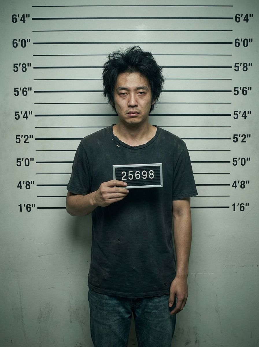 model mugshot with disheveled hair, tired expression, height measurement lines on wall behind, police station aesthetic