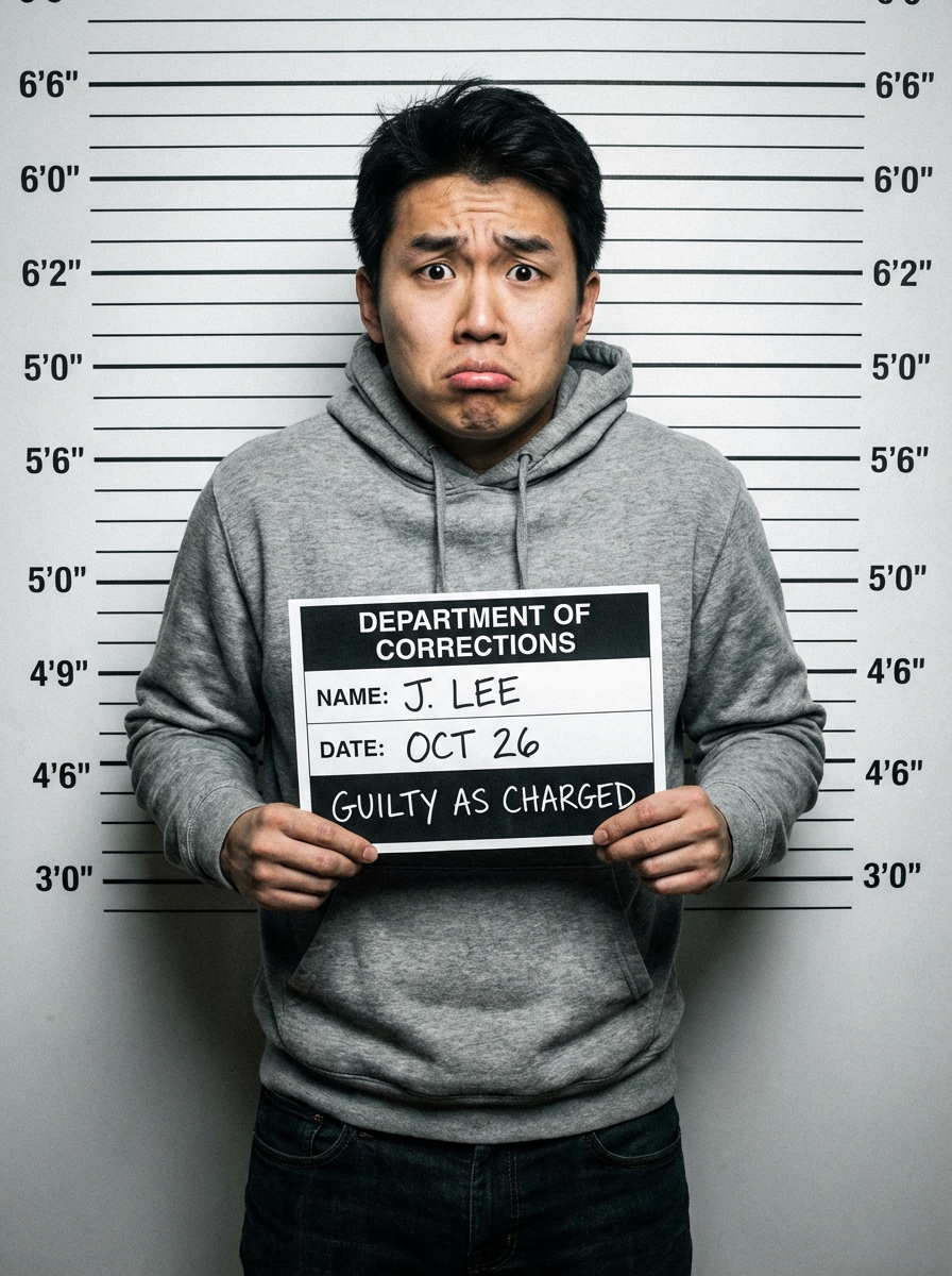 model mugshot with exaggerated guilty expression, comedic take, standard booking format