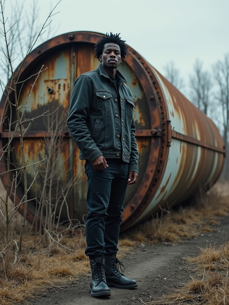 model near Chernobyl reactor sarcophagus, surrounded by rusting fences and overgrown debris. wearing black boots and black weathered jacket