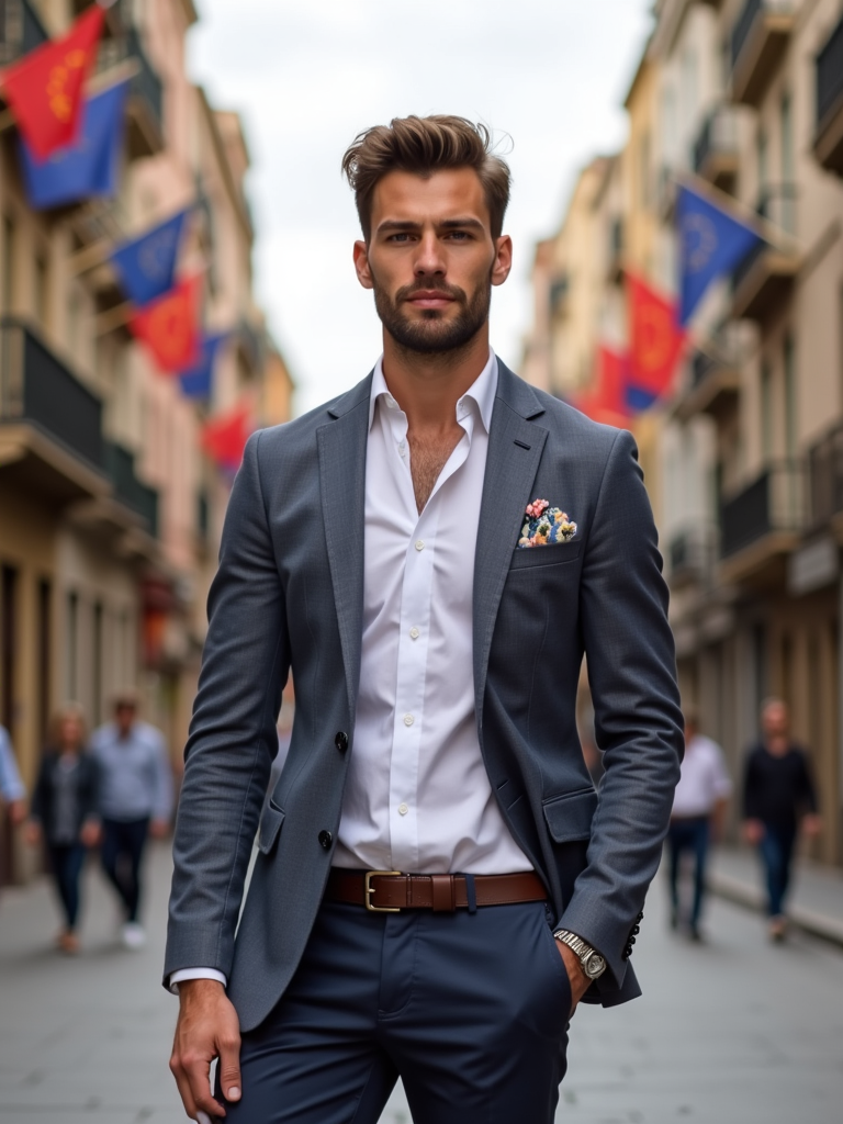 model on a Barcelona street decorated with European flags, wearing smart casual Mediterranean attire with European design elements, Gaudi's architecture visible in the background, embodying modern European city style