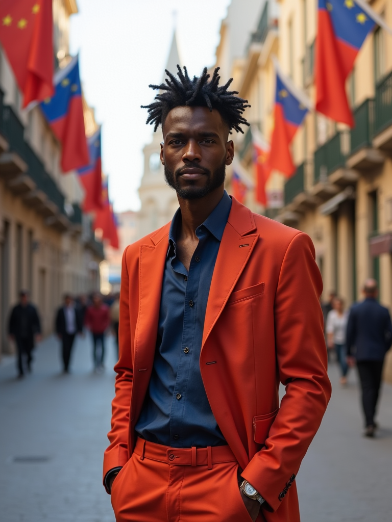 model on a Barcelona street decorated with European flags, wearing smart casual Mediterranean attire with European design elements, Gaudi's architecture visible in the background, embodying modern European city style