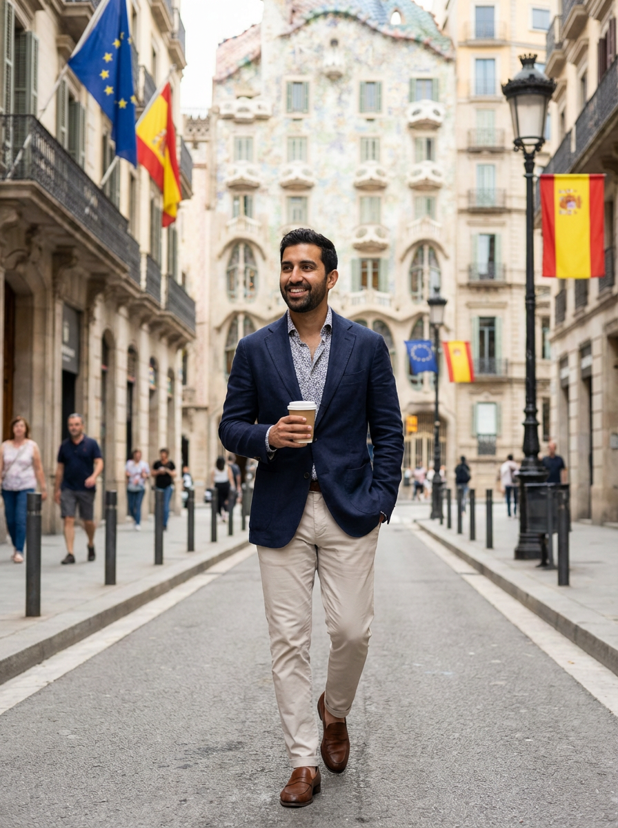 model on a Barcelona street decorated with European flags, wearing smart casual Mediterranean attire with European design elements, Gaudi's architecture visible in the background, embodying modern European city style