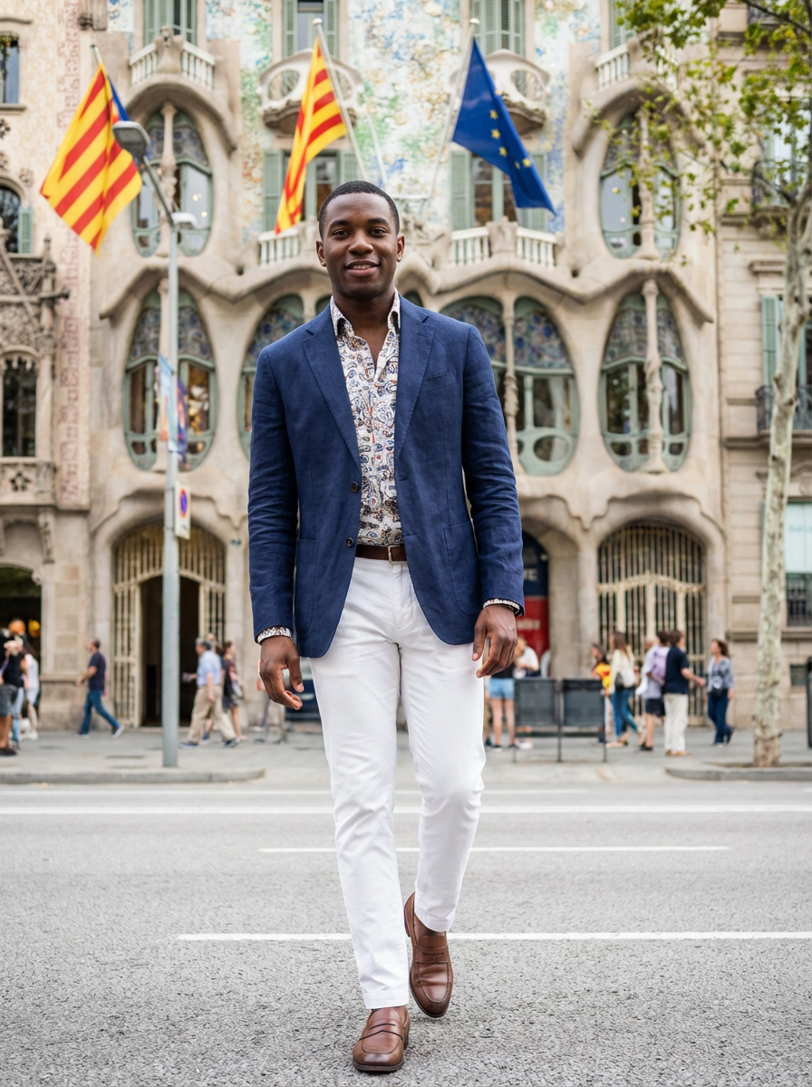 model on a Barcelona street decorated with European flags, wearing smart casual Mediterranean attire with European design elements, Gaudi's architecture visible in the background, embodying modern European city style