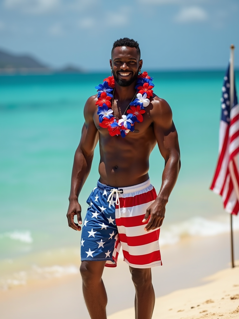 model on a beautiful beach in Hawaii, wearing American flag swim trunks and a patriotic tank top, with a lei of red, white and blue flowers around his neck, American flag planted proudly in the sand, crystal blue waters in the background
