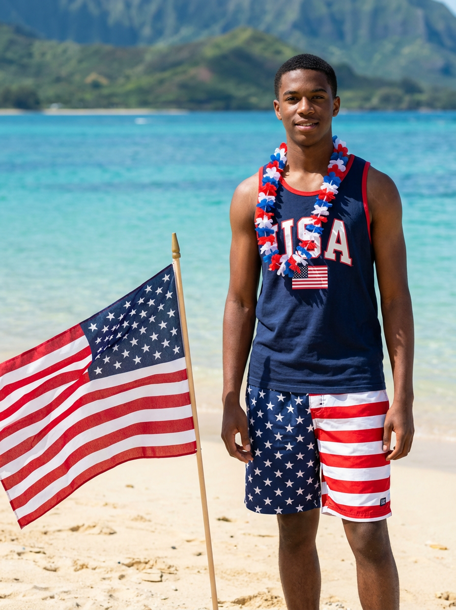model on a beautiful beach in Hawaii, wearing American flag swim trunks and a patriotic tank top, with a lei of red, white and blue flowers around his neck, American flag planted proudly in the sand, crystal blue waters in the background
