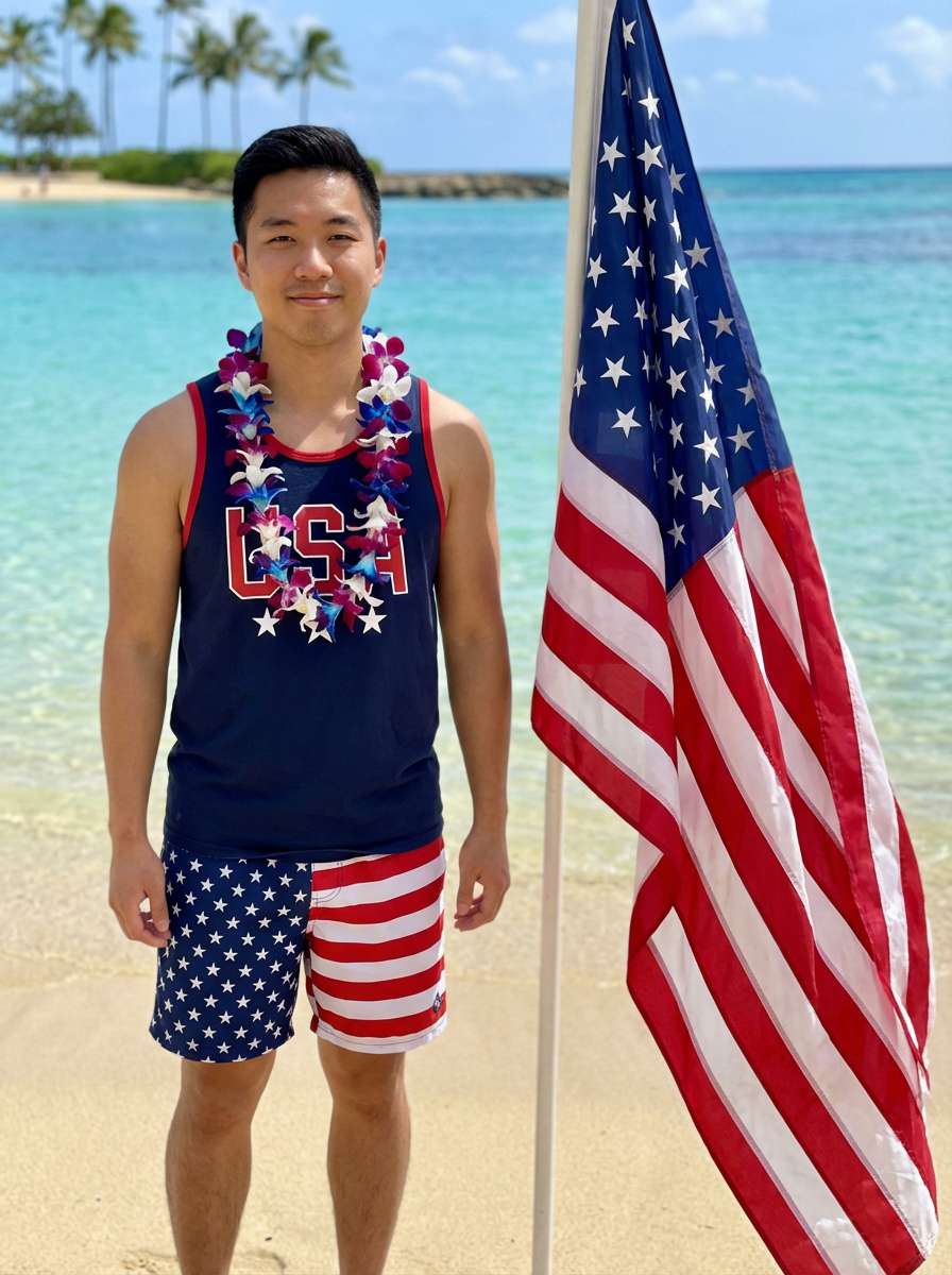 model on a beautiful beach in Hawaii, wearing American flag swim trunks and a patriotic tank top, with a lei of red, white and blue flowers around his neck, American flag planted proudly in the sand, crystal blue waters in the background