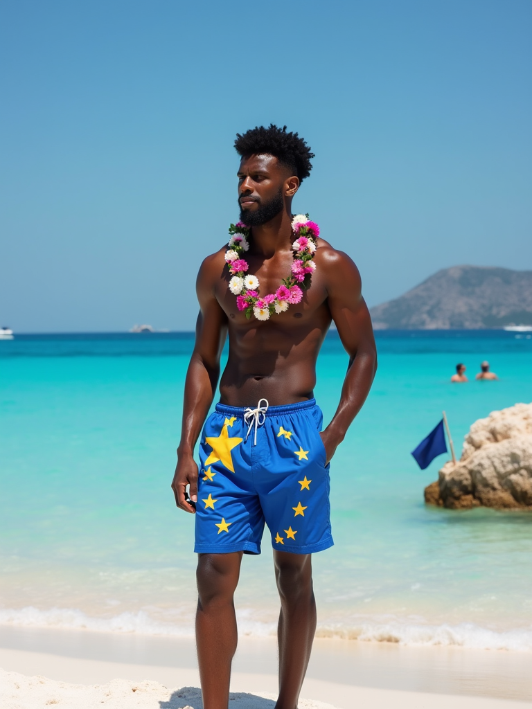 model on a beautiful Greek island beach, wearing blue swim shorts with European flag design, with a garland of Mediterranean flowers around his neck, European flag planted proudly in the sand, crystal blue Aegean waters in the background
