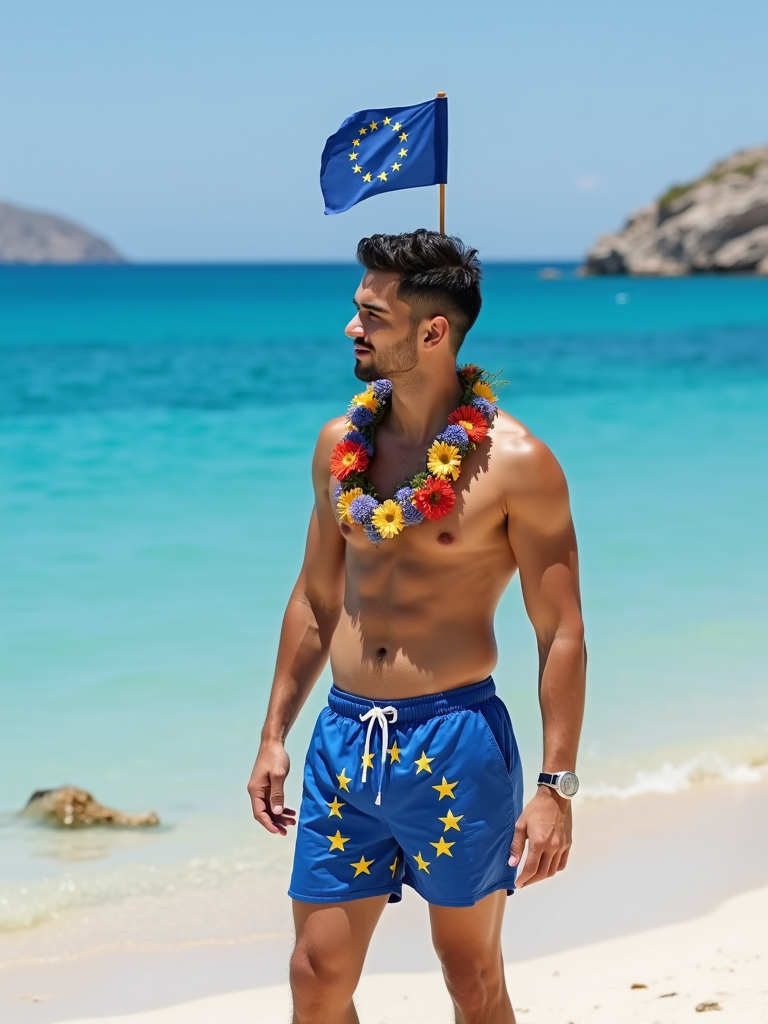 model on a beautiful Greek island beach, wearing blue swim shorts with European flag design, with a garland of Mediterranean flowers around his neck, European flag planted proudly in the sand, crystal blue Aegean waters in the background