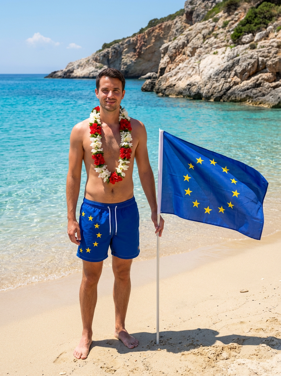 model on a beautiful Greek island beach, wearing blue swim shorts with European flag design, with a garland of Mediterranean flowers around his neck, European flag planted proudly in the sand, crystal blue Aegean waters in the background