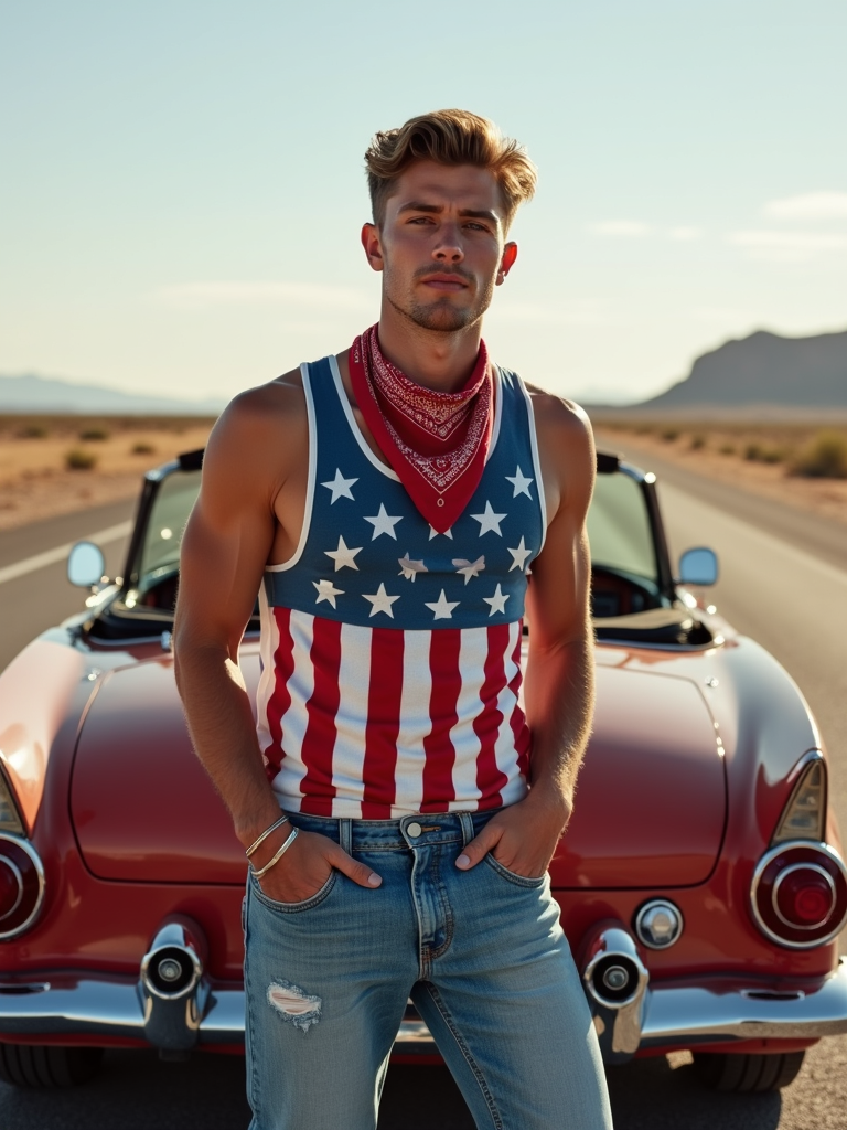 model on a classic American road trip, leaning against a vintage convertible on Route 66, wearing jeans and a bold American flag tank top, American flag bandana, desert landscape stretching behind, embodying freedom and American adventure