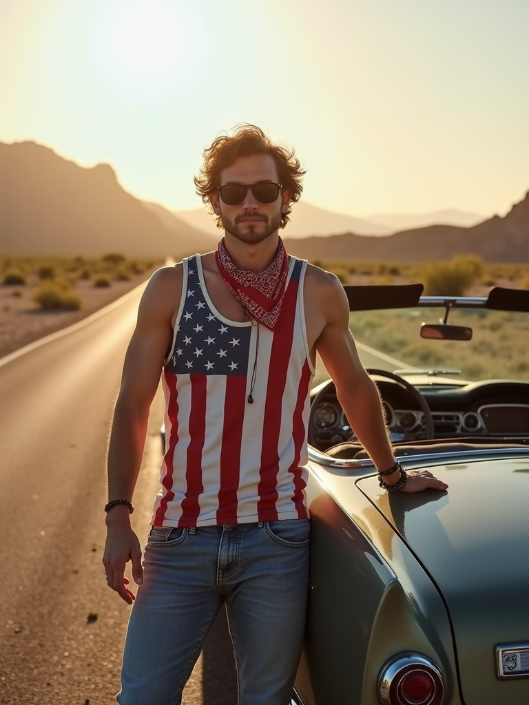 model on a classic American road trip, leaning against a vintage convertible on Route 66, wearing jeans and a bold American flag tank top, American flag bandana, desert landscape stretching behind, embodying freedom and American adventure