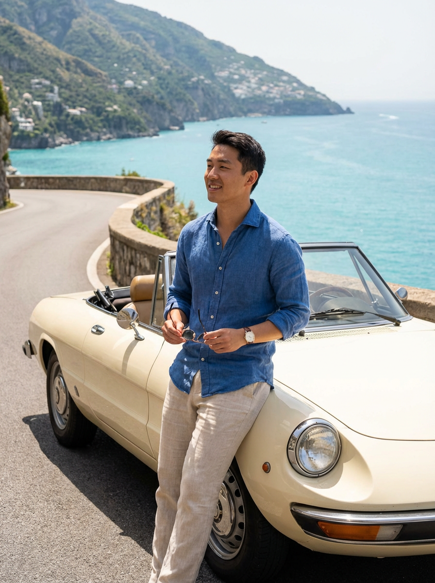 model on a classic European road trip, leaning against a vintage convertible on a coastal road in Amalfi, wearing linen pants and a blue shirt with rolled sleeves, Mediterranean Sea stretching behind, embodying freedom and European adventure