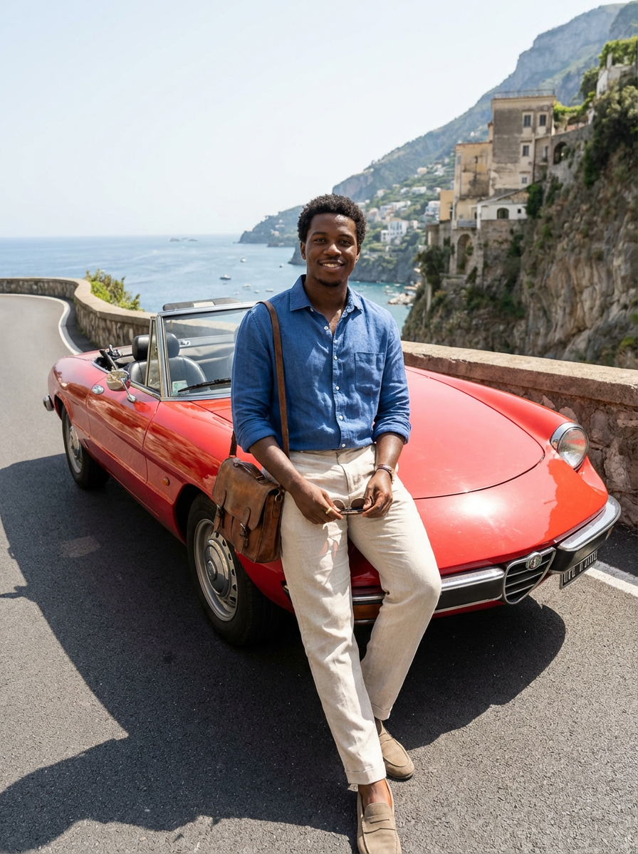 model on a classic European road trip, leaning against a vintage convertible on a coastal road in Amalfi, wearing linen pants and a blue shirt with rolled sleeves, Mediterranean Sea stretching behind, embodying freedom and European adventure