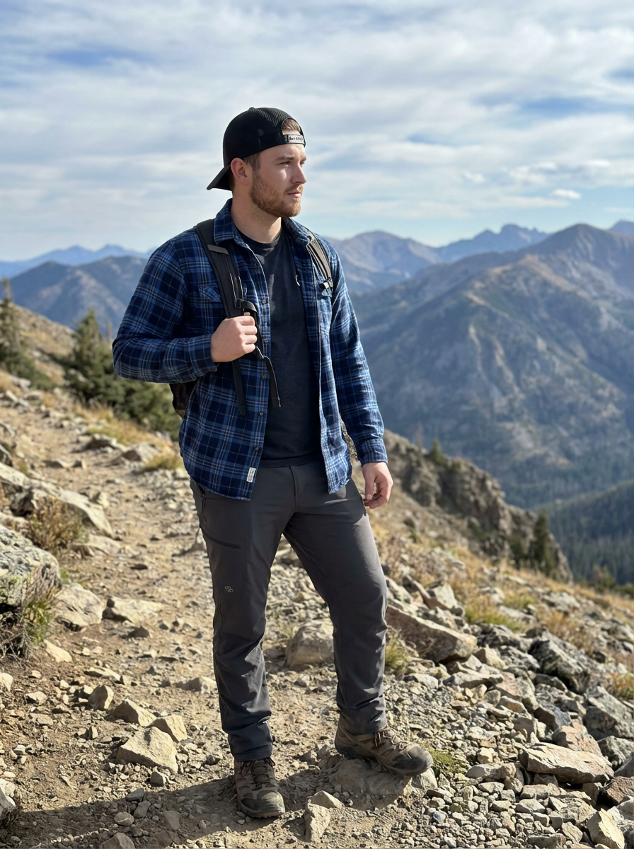 model on a hiking trail, overlooking a breathtaking mountain landscape
