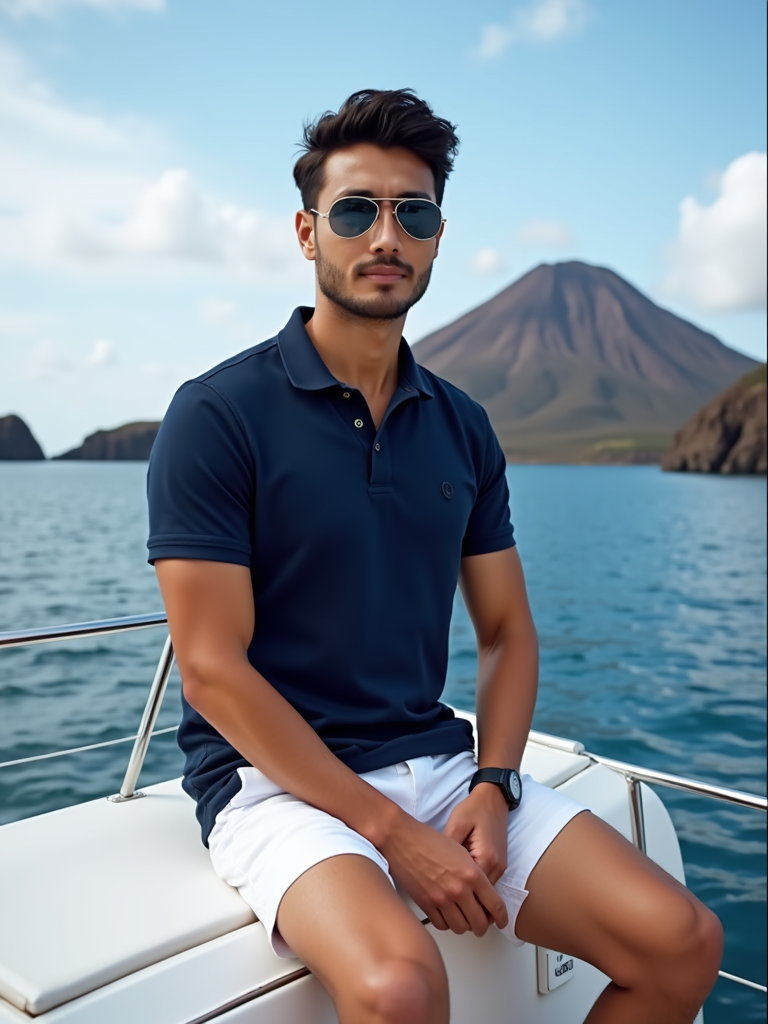 model on a luxury catamaran cruise, wearing white shorts with a navy blue polo, sailing past volcanic islands