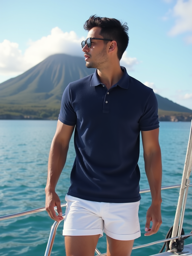 model on a luxury catamaran cruise, wearing white shorts with a navy blue polo, sailing past volcanic islands