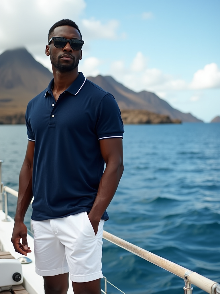 model on a luxury catamaran cruise, wearing white shorts with a navy blue polo, sailing past volcanic islands