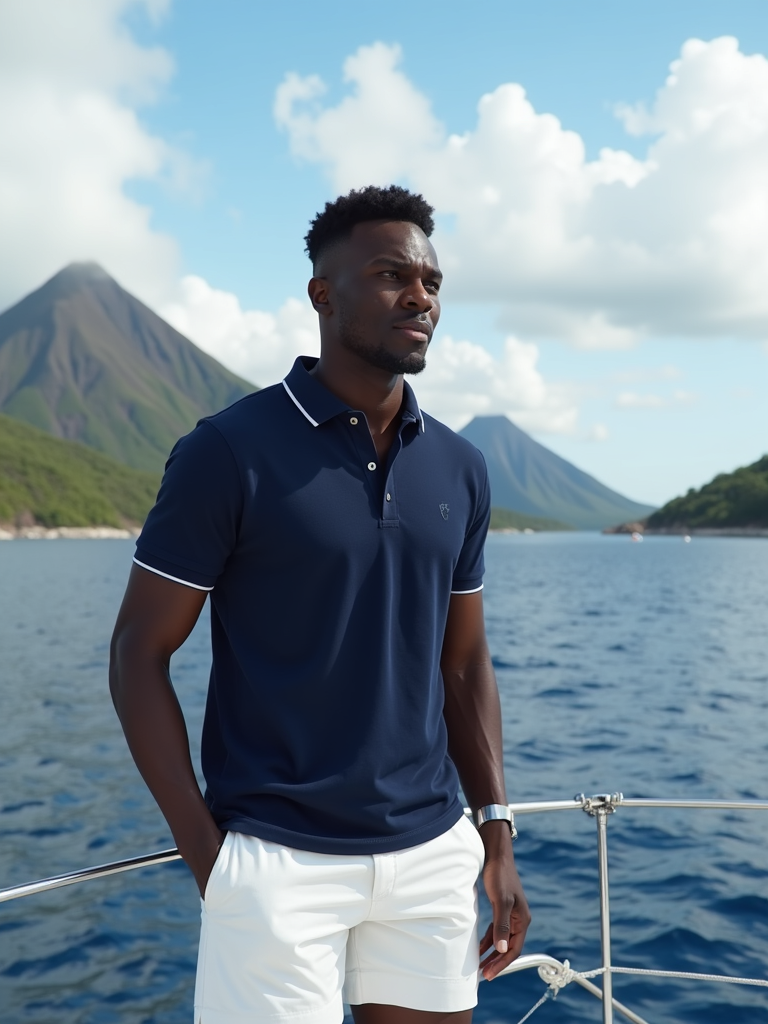 model on a luxury catamaran cruise, wearing white shorts with a navy blue polo, sailing past volcanic islands