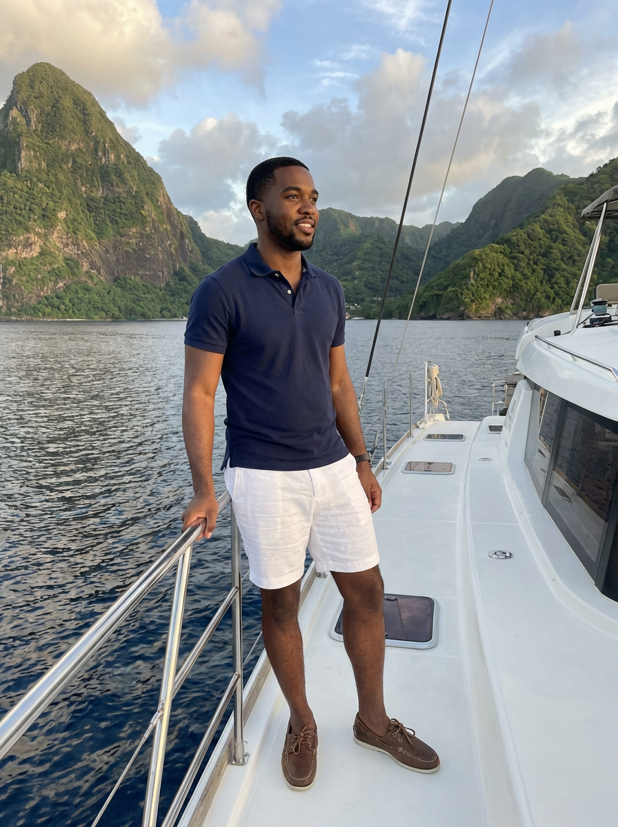 model on a luxury catamaran cruise, wearing white shorts with a navy blue polo, sailing past volcanic islands