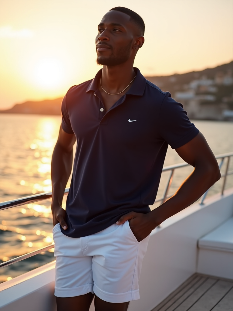 model on a luxury yacht at sunset, wearing white shorts with a navy blue polo, Mykonos coastline in background