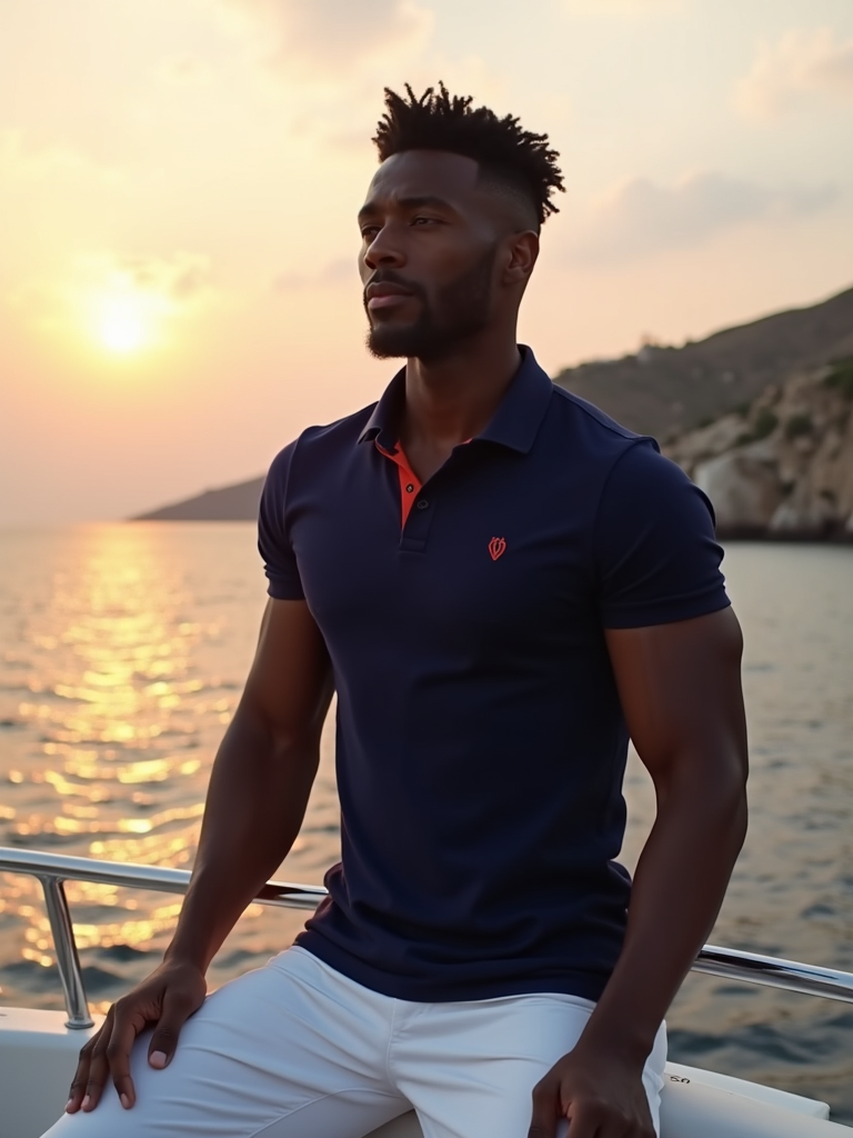 model on a luxury yacht at sunset, wearing white shorts with a navy blue polo, Mykonos coastline in background