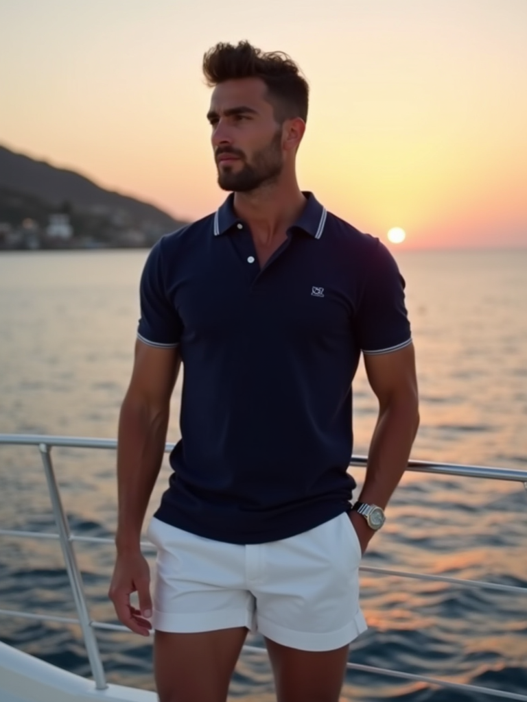 model on a luxury yacht at sunset, wearing white shorts with a navy blue polo, Mykonos coastline in background