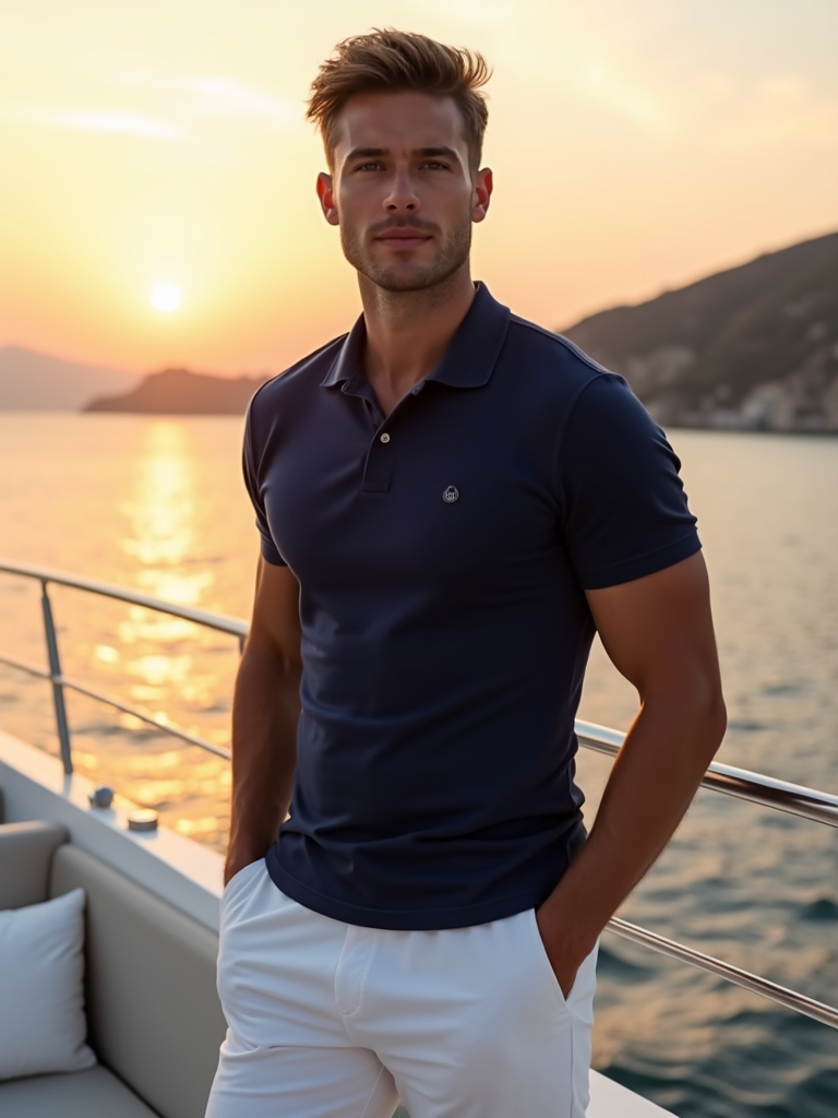 model on a luxury yacht at sunset, wearing white shorts with a navy blue polo, Mykonos coastline in background
