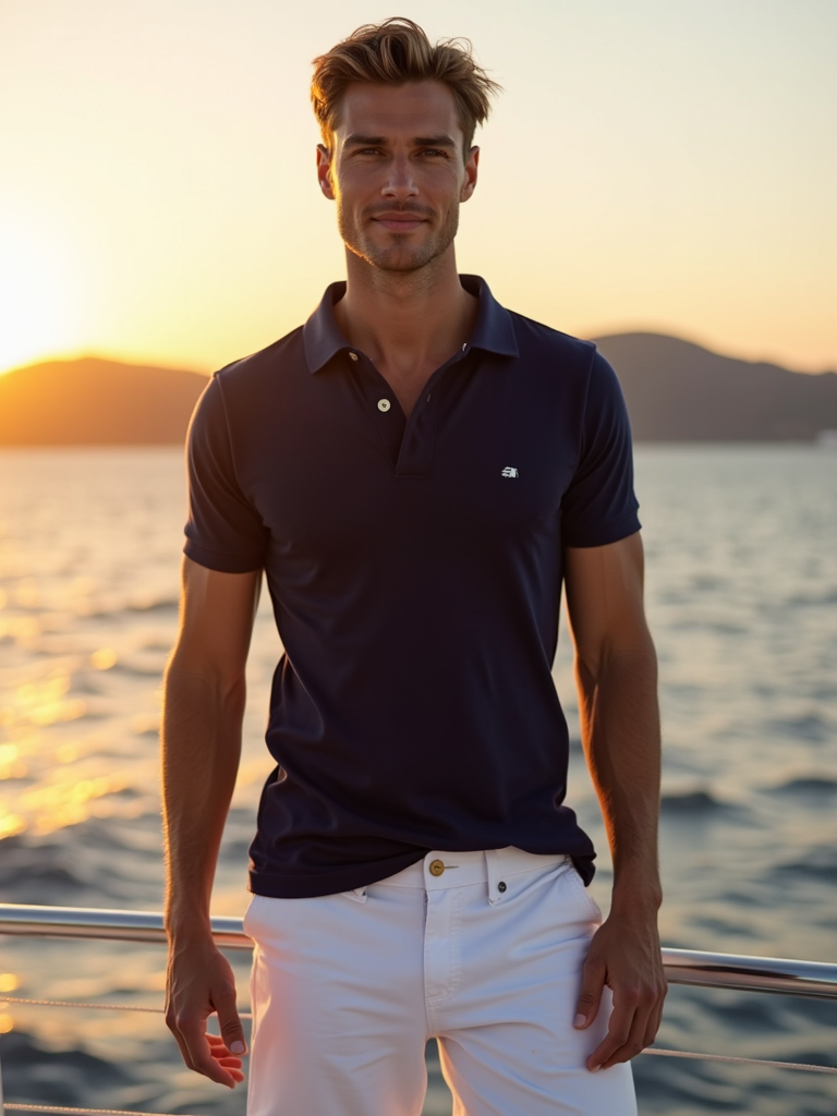 model on a luxury yacht at sunset, wearing white shorts with a navy blue polo, Mykonos coastline in background
