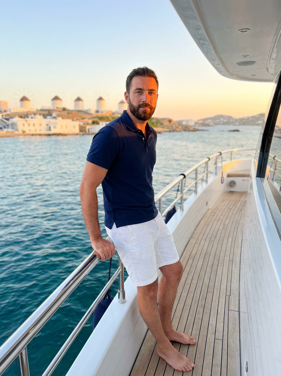 model on a luxury yacht at sunset, wearing white shorts with a navy blue polo, Mykonos coastline in background