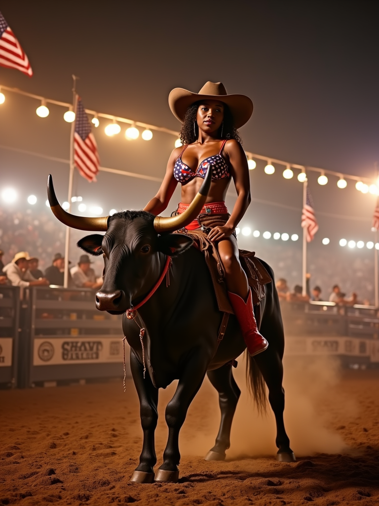 model on a mechanical bull wearing a stars and stripes bikini and red cowboy boots. American flags hang proudly in the background as the rodeo lights glow around in a warm, patriotic atmosphere
