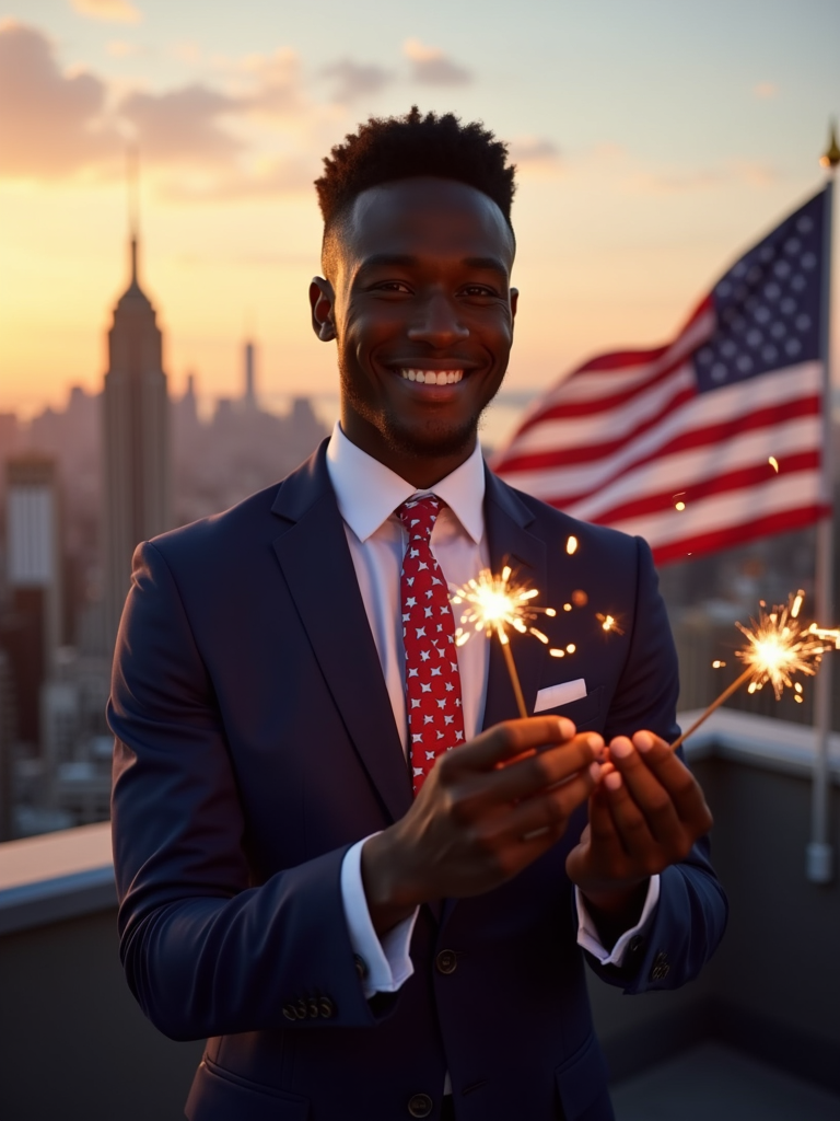 model on a New York City rooftop at sunset, Manhattan skyline in the background, wearing a sharp navy blue suit with American flag tie, holding sparklers that illuminate his face with a golden glow, American flags waving proudly nearby
