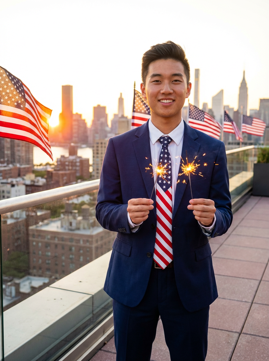 model on a New York City rooftop at sunset, Manhattan skyline in the background, wearing a sharp navy blue suit with American flag tie, holding sparklers that illuminate his face with a golden glow, American flags waving proudly nearby