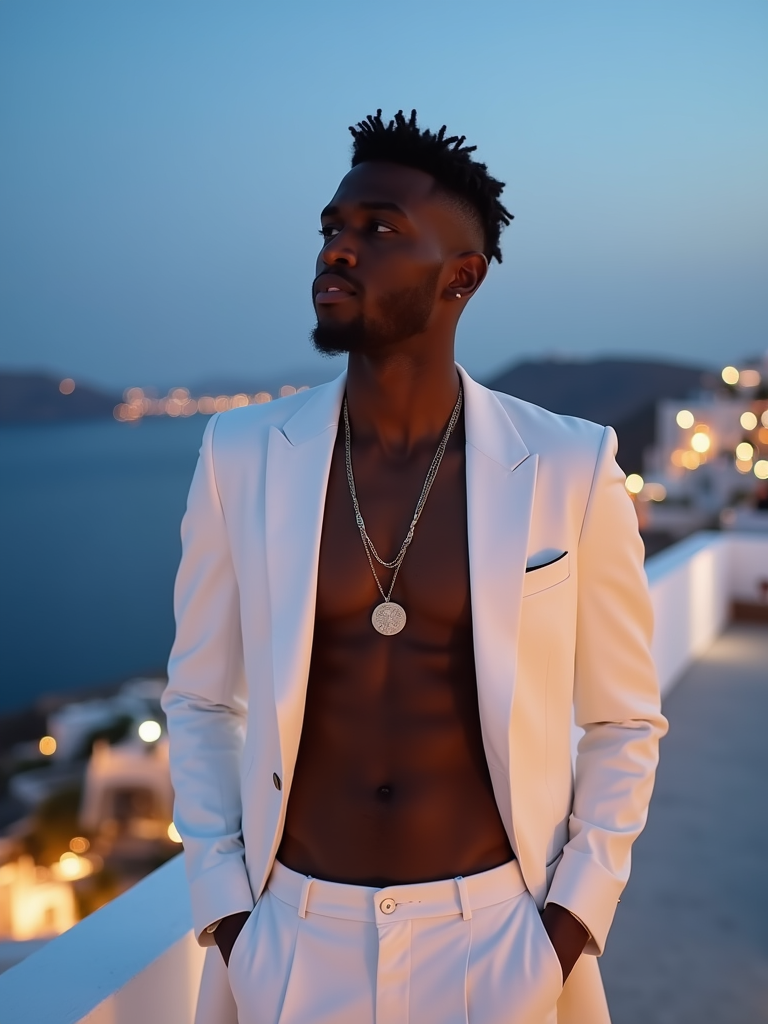 model on a private terrace overlooking Mykonos Town, wearing a sophisticated white suit with no tie, twinkling city lights below