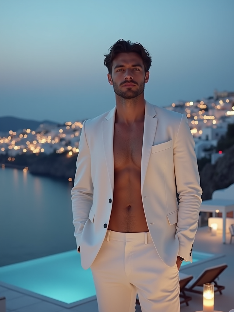 model on a private terrace overlooking Mykonos Town, wearing a sophisticated white suit with no tie, twinkling city lights below