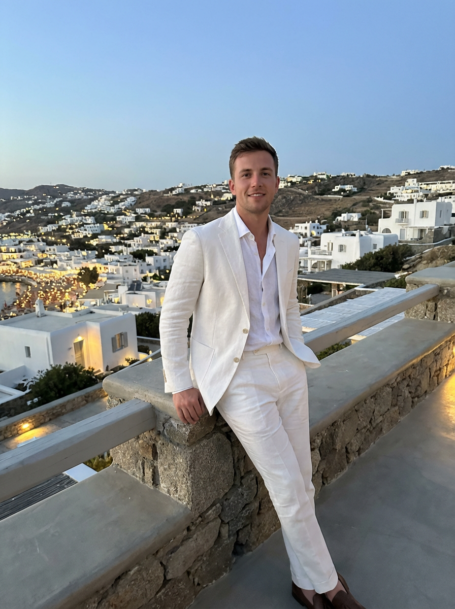 model on a private terrace overlooking Mykonos Town, wearing a sophisticated white suit with no tie, twinkling city lights below