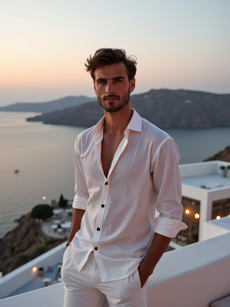 model on a rooftop bar in Mykonos Town, wearing white pants with a designer shirt, island panorama at dusk