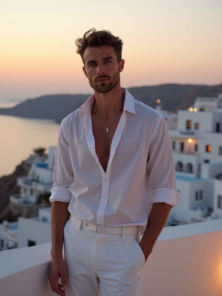 model on a rooftop bar in Mykonos Town, wearing white pants with a designer shirt, island panorama at dusk