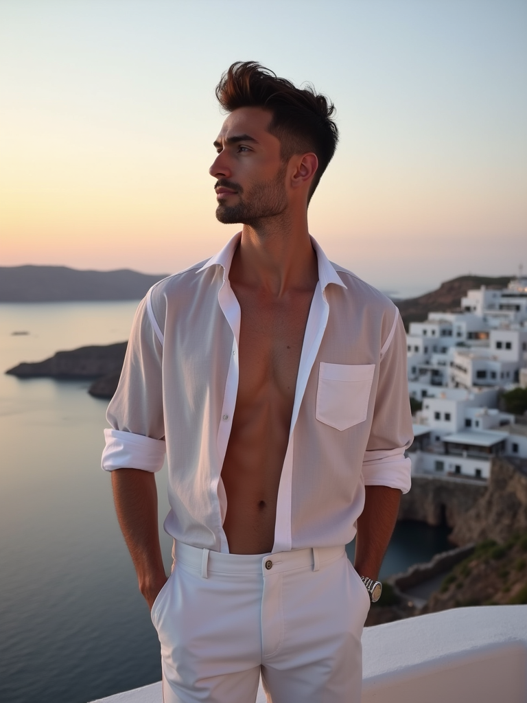 model on a rooftop bar in Mykonos Town, wearing white pants with a designer shirt, island panorama at dusk