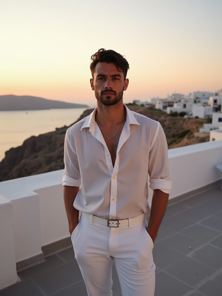 model on a rooftop bar in Mykonos Town, wearing white pants with a designer shirt, island panorama at dusk