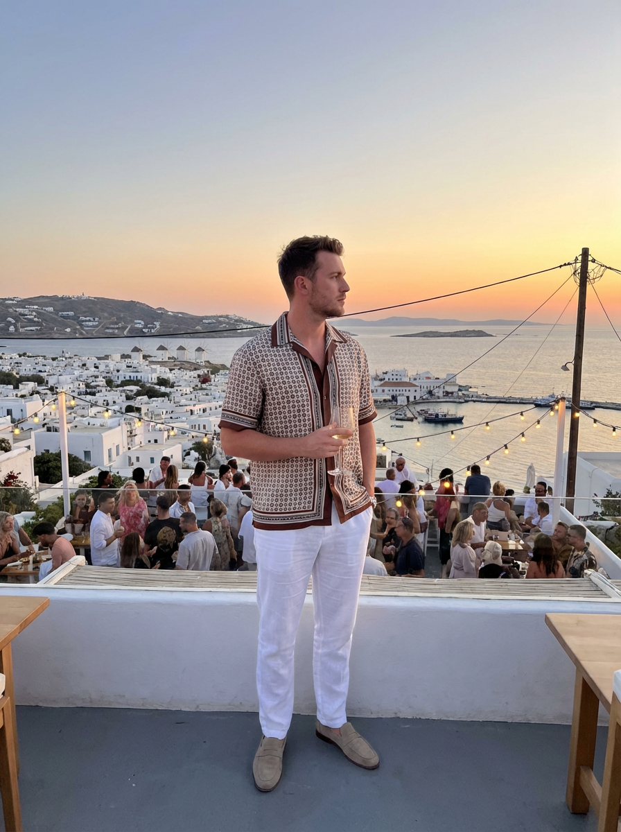 model on a rooftop bar in Mykonos Town, wearing white pants with a designer shirt, island panorama at dusk