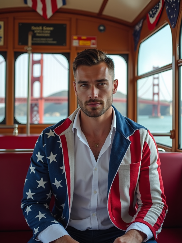 model on a San Francisco trolley decorated with patriotic bunting, wearing casual smart attire with American flag design elements, Golden Gate Bridge draped with a giant American flag visible in the background, embodying iconic American city pride