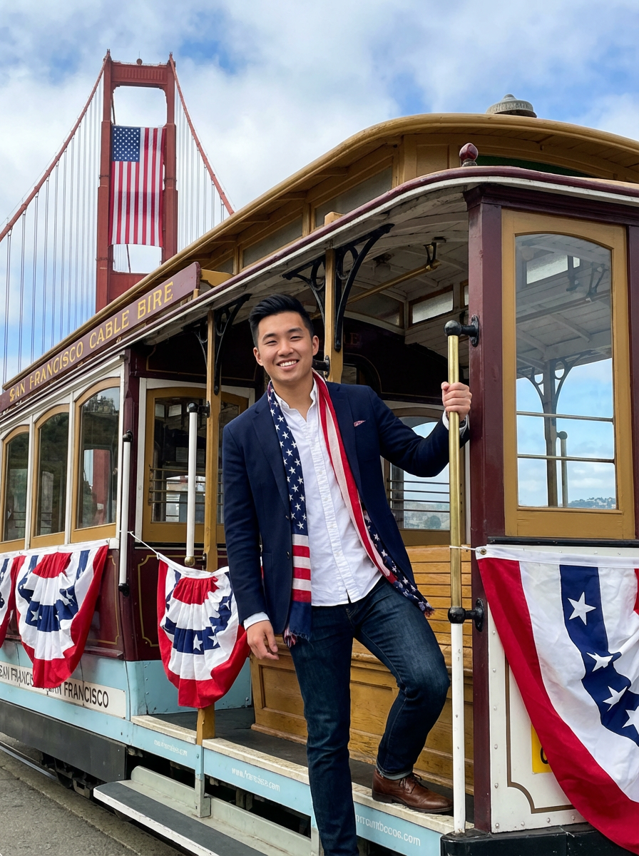 model on a San Francisco trolley decorated with patriotic bunting, wearing casual smart attire with American flag design elements, Golden Gate Bridge draped with a giant American flag visible in the background, embodying iconic American city pride