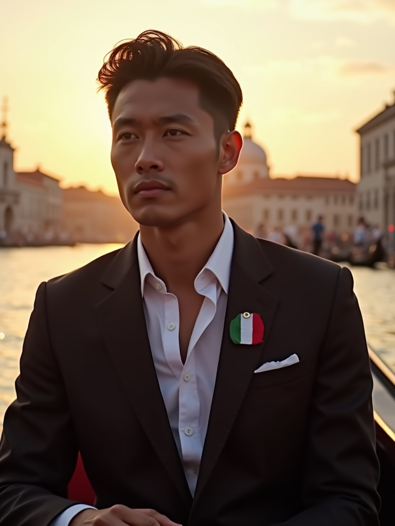 model on a Venice gondola at sunset, Grand Canal in the background, wearing a sharp Italian suit with European flag pin, the golden light illuminating his face, historic buildings and bridges creating a timeless European scene