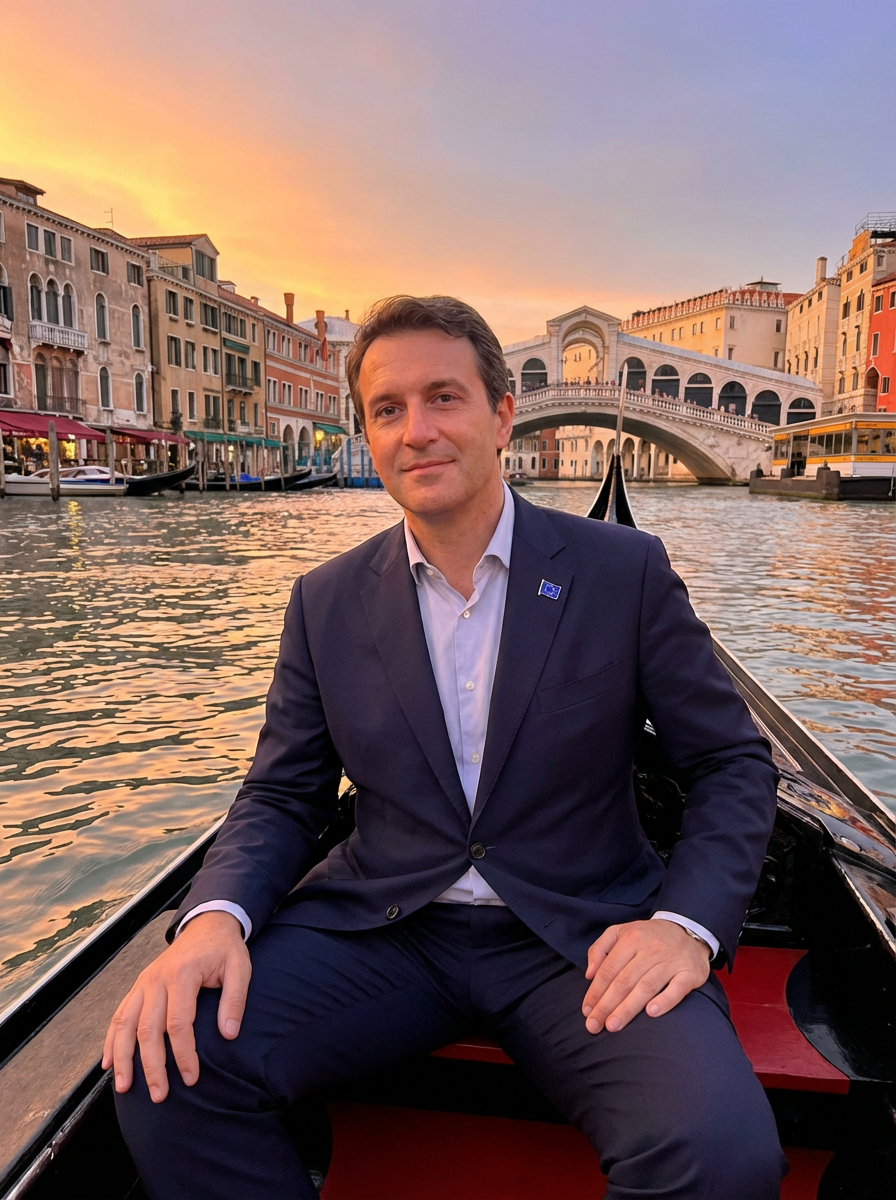 model on a Venice gondola at sunset, Grand Canal in the background, wearing a sharp Italian suit with European flag pin, the golden light illuminating his face, historic buildings and bridges creating a timeless European scene