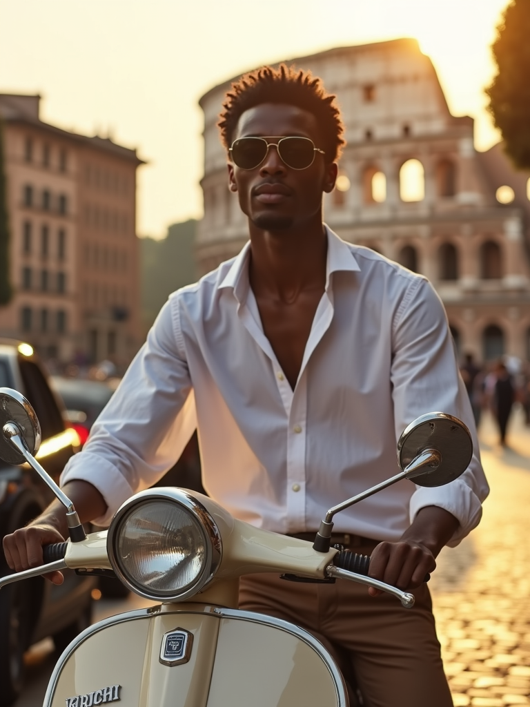 model on a vintage Vespa scooter in Rome, wearing a stylish linen shirt and tailored pants, the Colosseum visible in the background, golden hour sunlight creating a warm Mediterranean glow