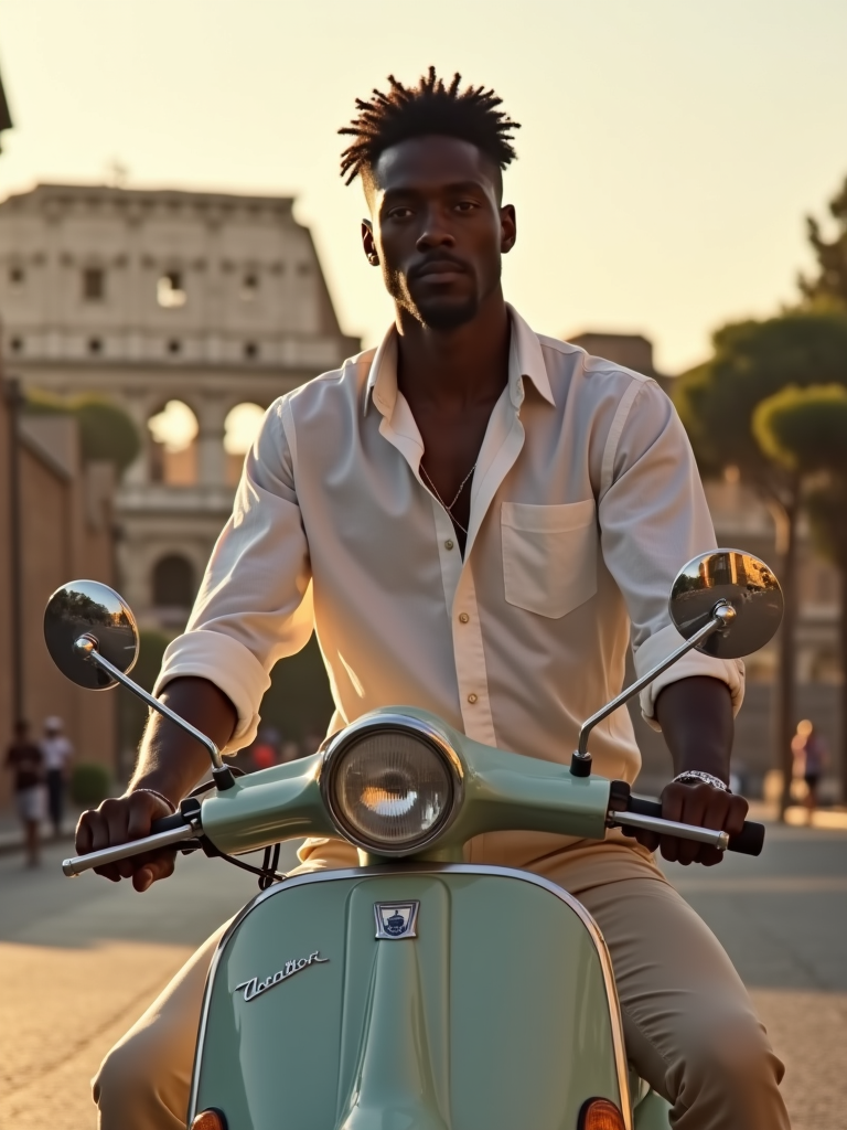 model on a vintage Vespa scooter in Rome, wearing a stylish linen shirt and tailored pants, the Colosseum visible in the background, golden hour sunlight creating a warm Mediterranean glow