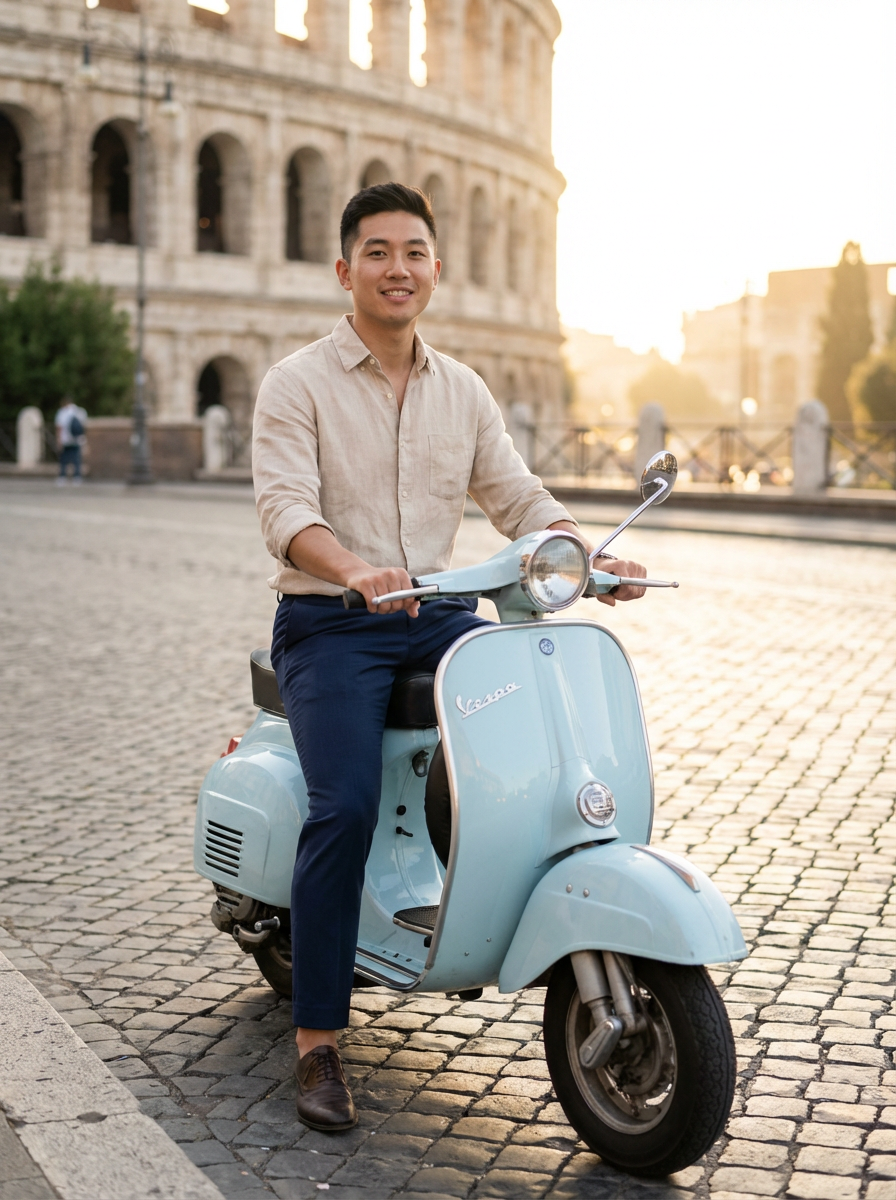 model on a vintage Vespa scooter in Rome, wearing a stylish linen shirt and tailored pants, the Colosseum visible in the background, golden hour sunlight creating a warm Mediterranean glow
