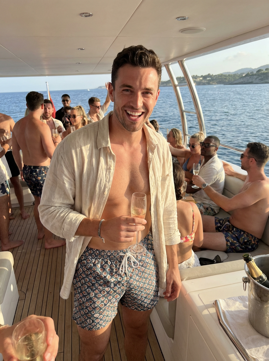 model on bachelor party boat, yacht or boat party, swim trunks, ocean backdrop, living the life