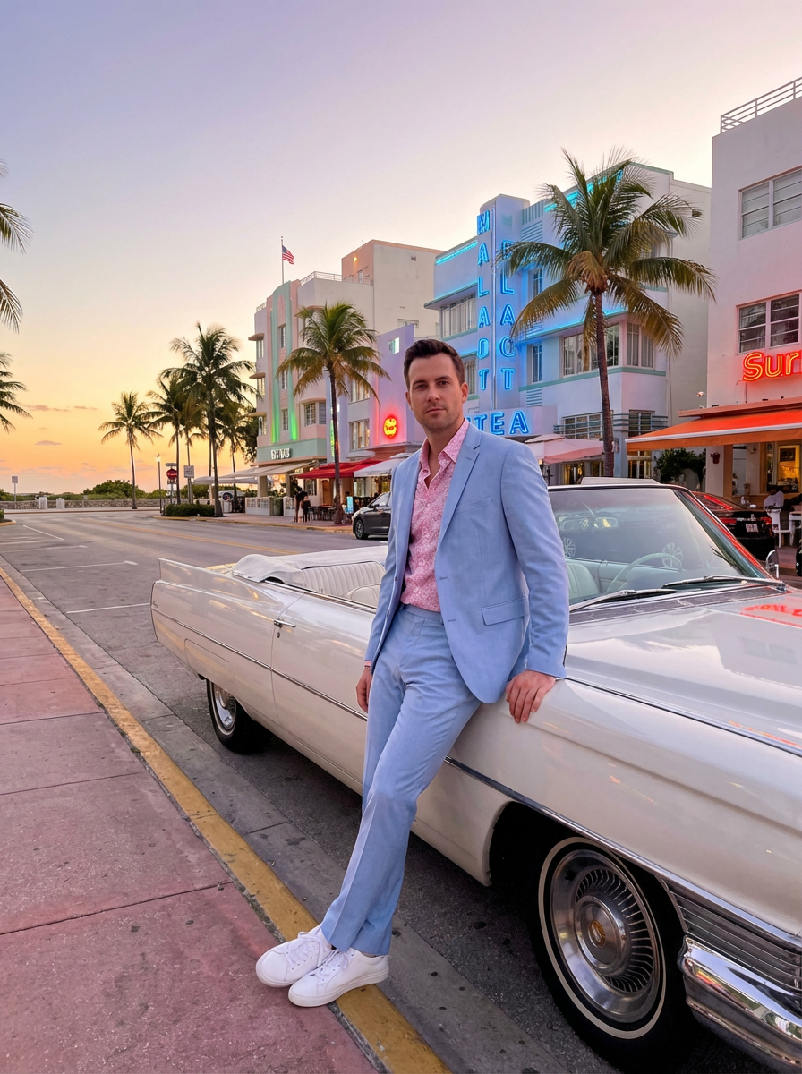 model on Ocean Drive, pastel art deco buildings, convertible car, glamorous Miami style, sunset